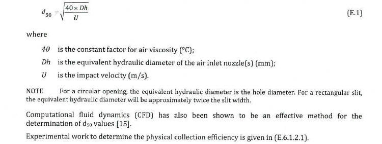 BS EN 17141:2020 (E.5.2) "The average equivalent diameters of microbe-carrying-particles (MCPs) that form the cfu are generally larger than 1 µm and a d50 value smaller than 2 µm is considered appropriate." BS EN 17141 section E.6 requires both an experimental d50 and a biological collection efficiency study be conducted to validate the above Theoretical d50.